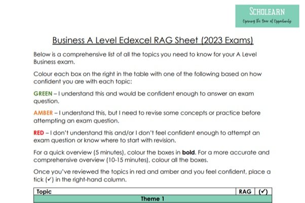 Use this free printable to track your current progress for Edexcel Business A Level. Simply colour in the boxes for each topic depending on your confidence and see what you need to study next in order to achieve your desired grade.